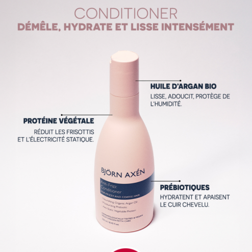 • Étape 2 : Anti-Frizz Conditioner Appliquer sur les longueurs et pointes, laisser agir quelques minutes puis rincer.