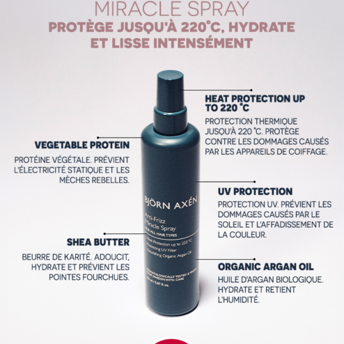 • Étape 3 : Anti-Frizz Miracle Spray Vaporiser généreusement sur cheveux essorés, des racines aux pointes. Peigner pour répartir le produit. Indispensable avant l'utilisation du sèche-cheveux ou du lisseur pour protéger la fibre jusqu'à 220 °C. Sécher au sèche-cheveux pour activer les agents lissants.