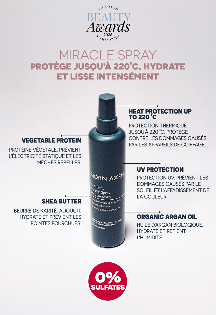 Grâce à sa formule sans sulfates, ce trio nettoie en douceur, nourrit intensément la fibre capillaire et aide à réduire les frisottis dès la racine. L'ajout du Anti-Frizz Miracle Spray apporte une finition parfaite : il agit comme un bouclier invisible pour apporter de la brillance, de la douceur et une texture soyeuse. Il protège également vos cheveux des dommages causés par la chaleur des appareils de coiffage jusqu'à 220 °C.